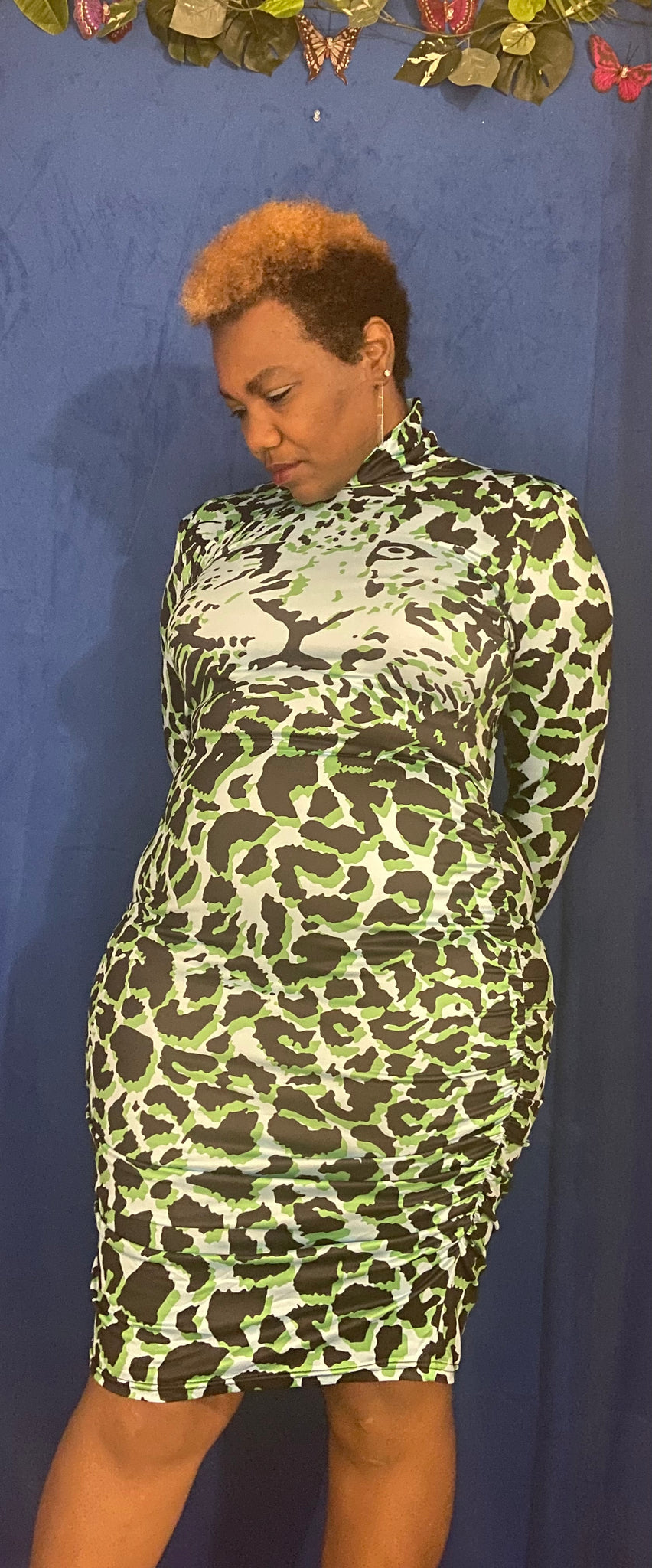 Sexy Leopard High Neck Long Sleeve Dress (Green)