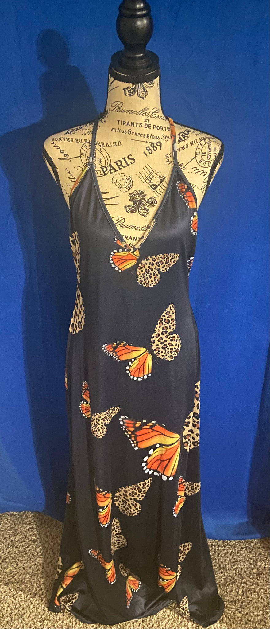 V Neck Butterfly Print Backless Sleeveless Maxi Dress (Blue)