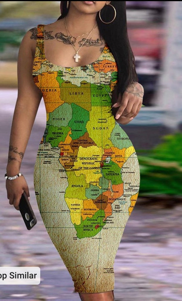 Map Print Sleeveless U-Neck Bodycon Dress (Green-Large)