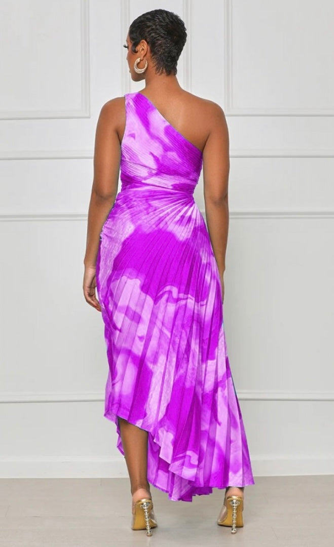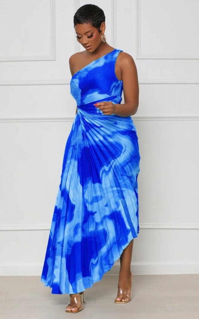 Summer Pleated Slant Shoulder Sleeveless Dress -Polyester Fabric