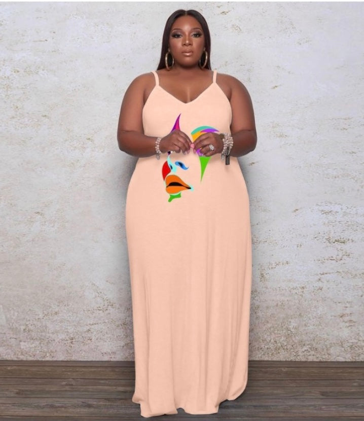 Plus Size Sleeveless Abstract Face Maxi Dress- Polyester Fabric