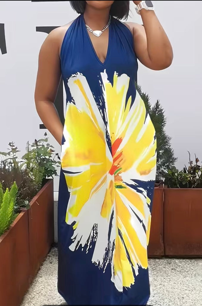 Women Floral Print Halter Backless Maxi Dress ( With Pockets)