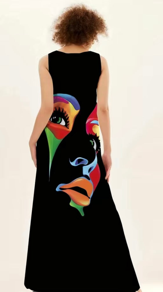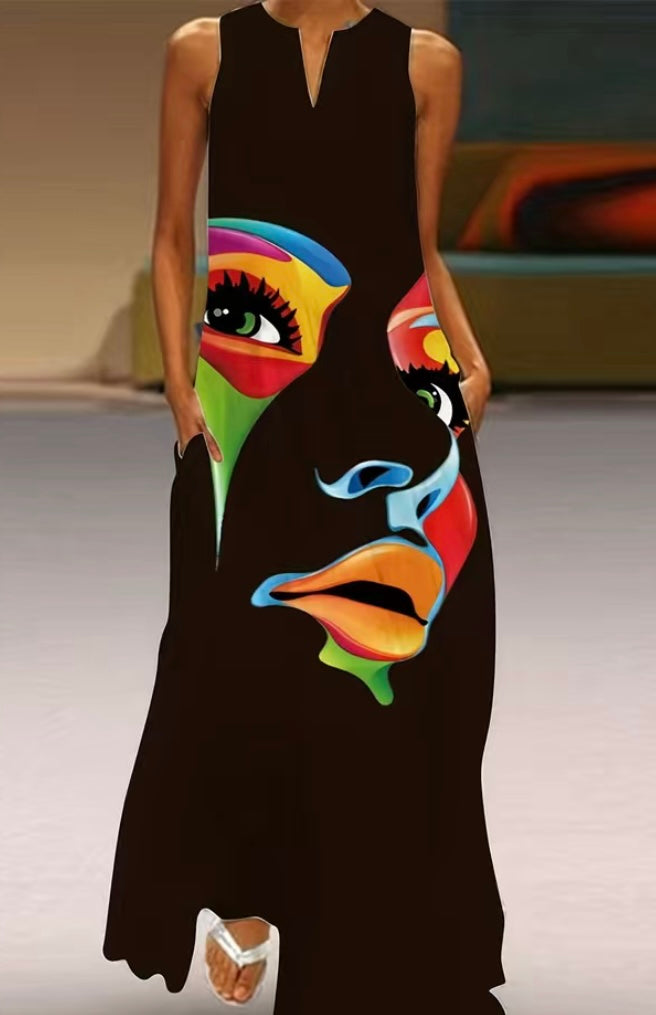 Abstract Face Print Maxi Dress, Notched Neck Sleeveless