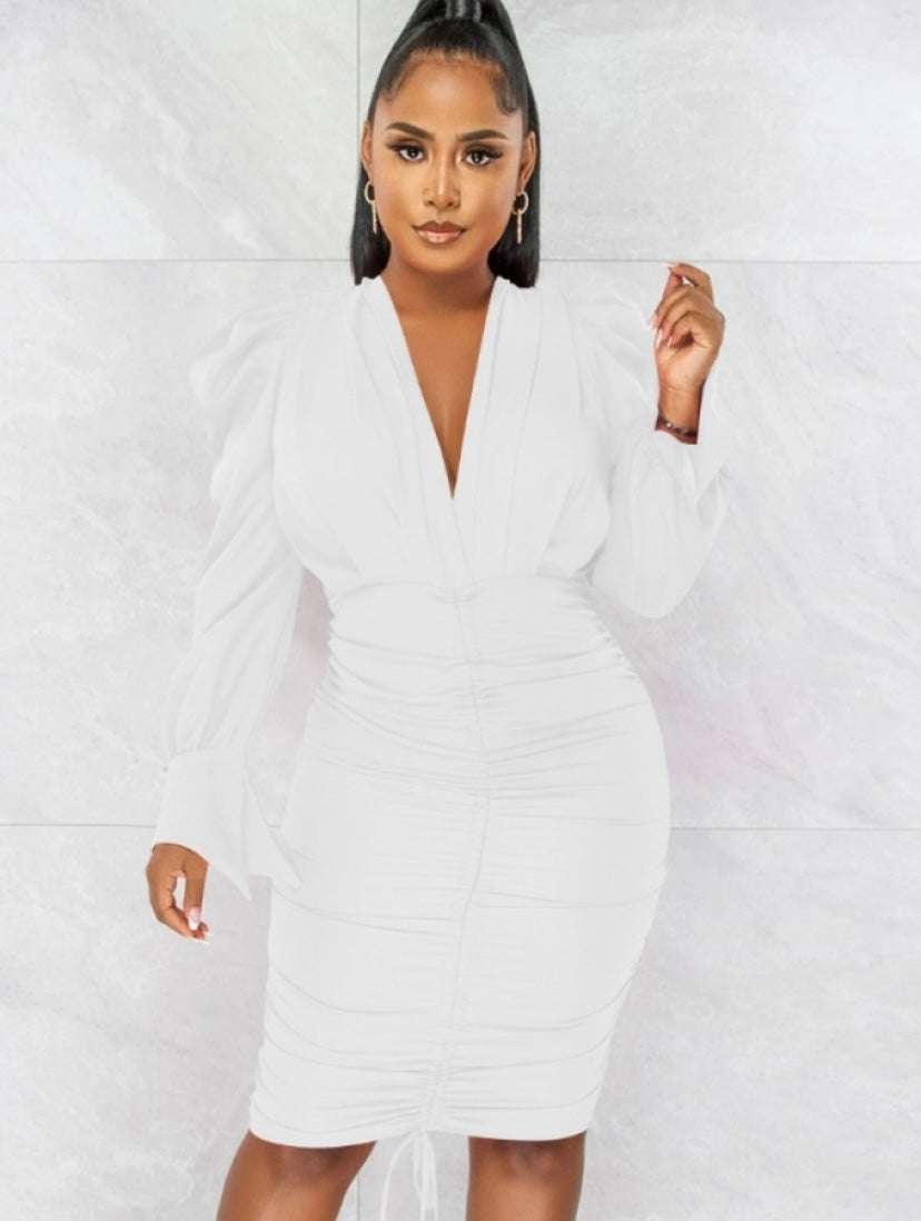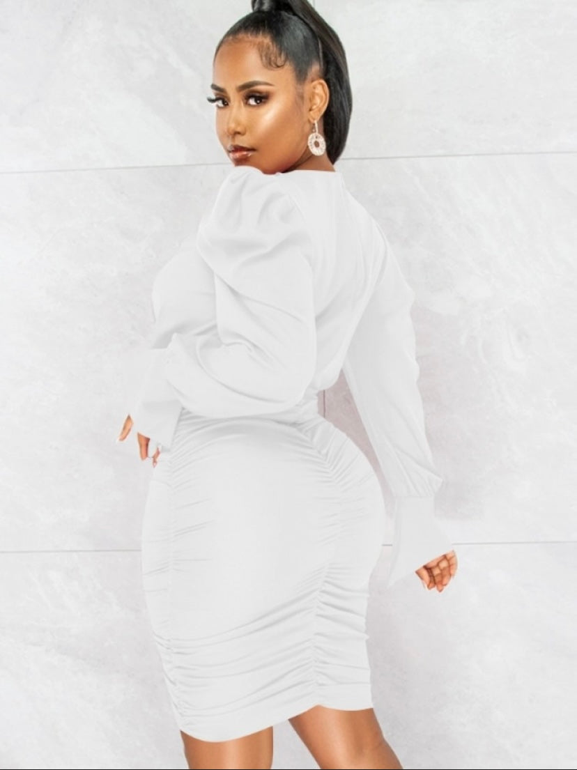 V-Neck Fall White Ruched Puff Sleeve Short Dress