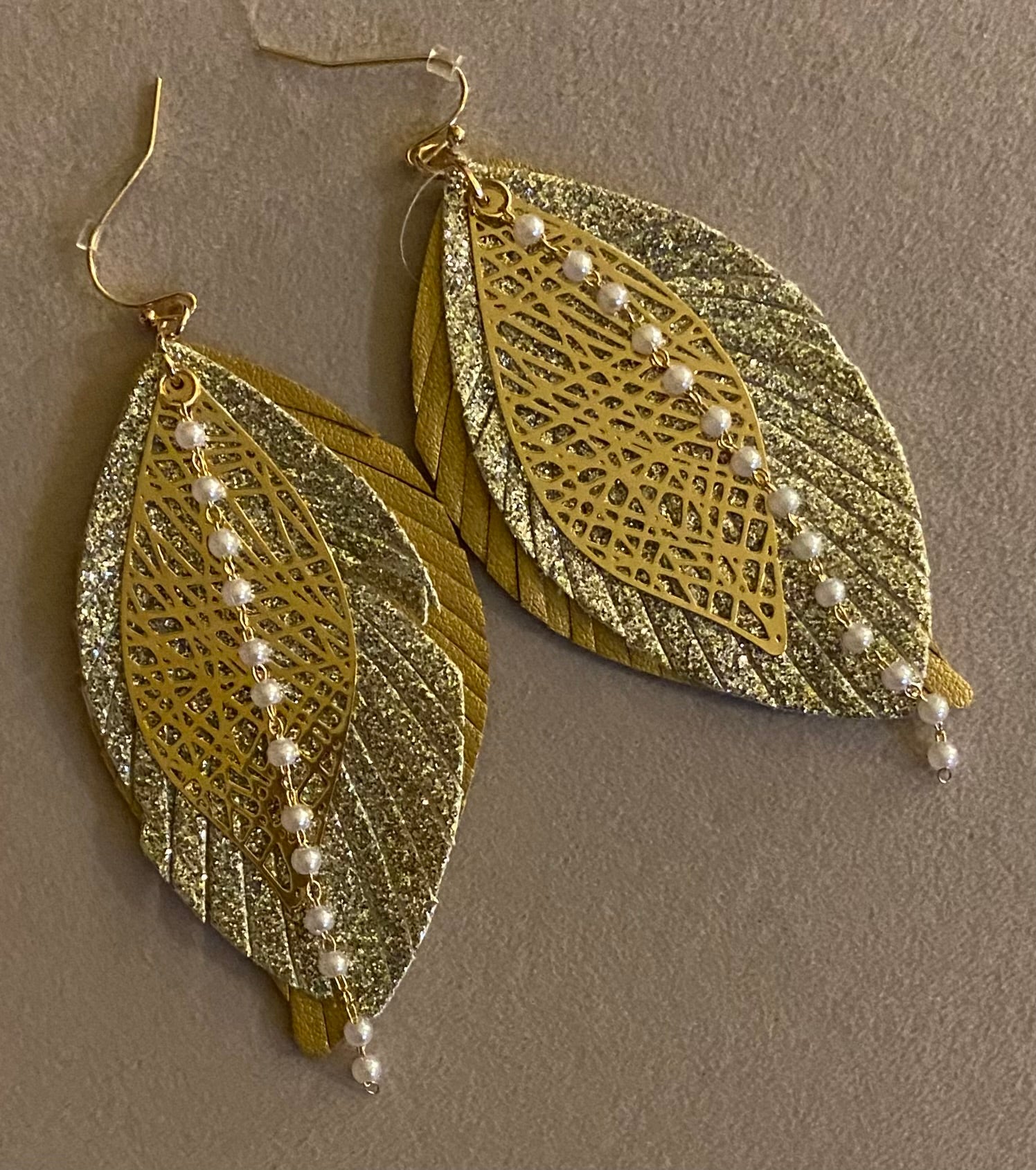 Gold & Silver Drop Leaf Earrings with Tiny Costume Pearls