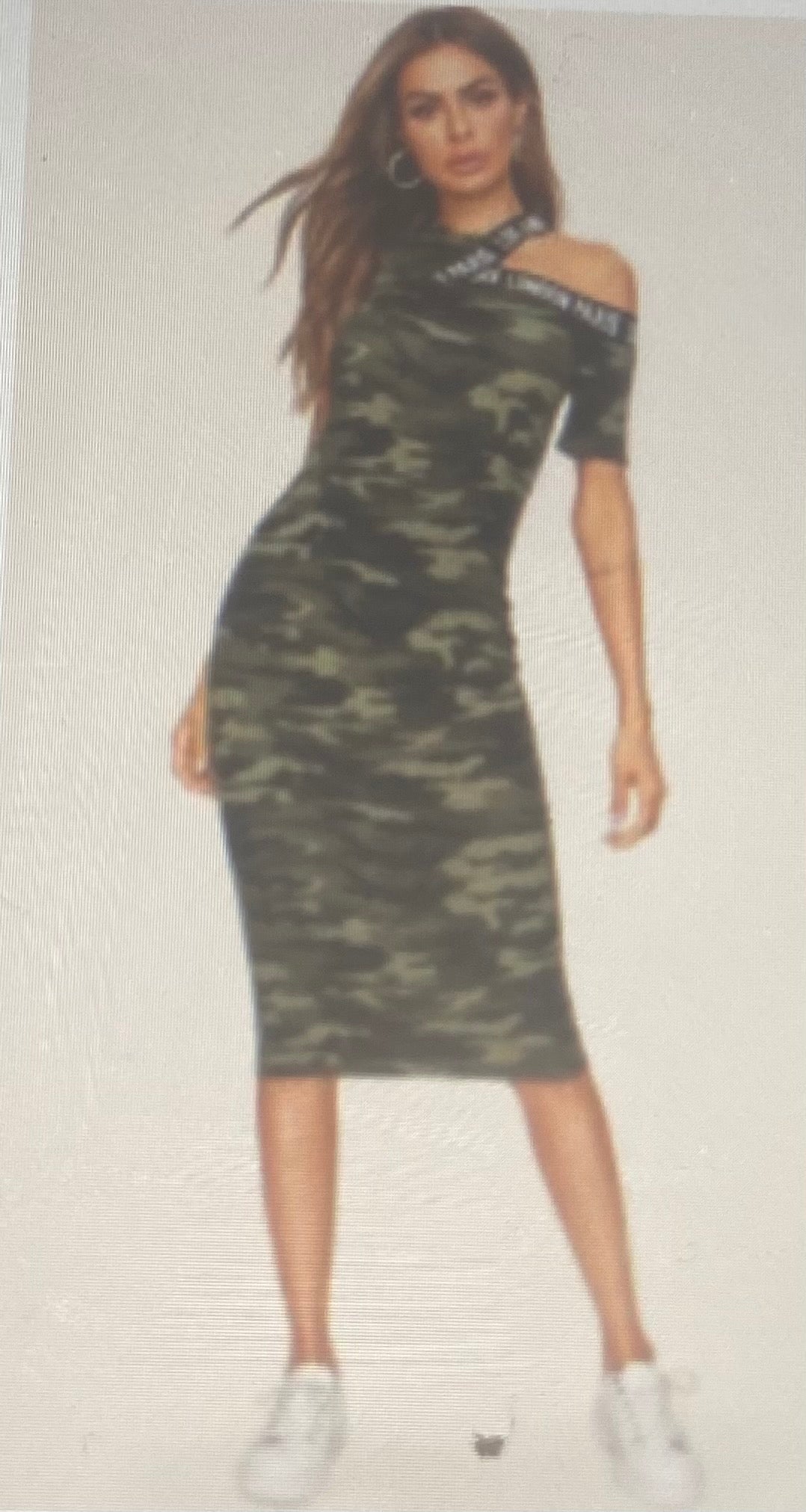 Asymmetrical Shoulder Letter Tape Camo Dress ( Size-Large)