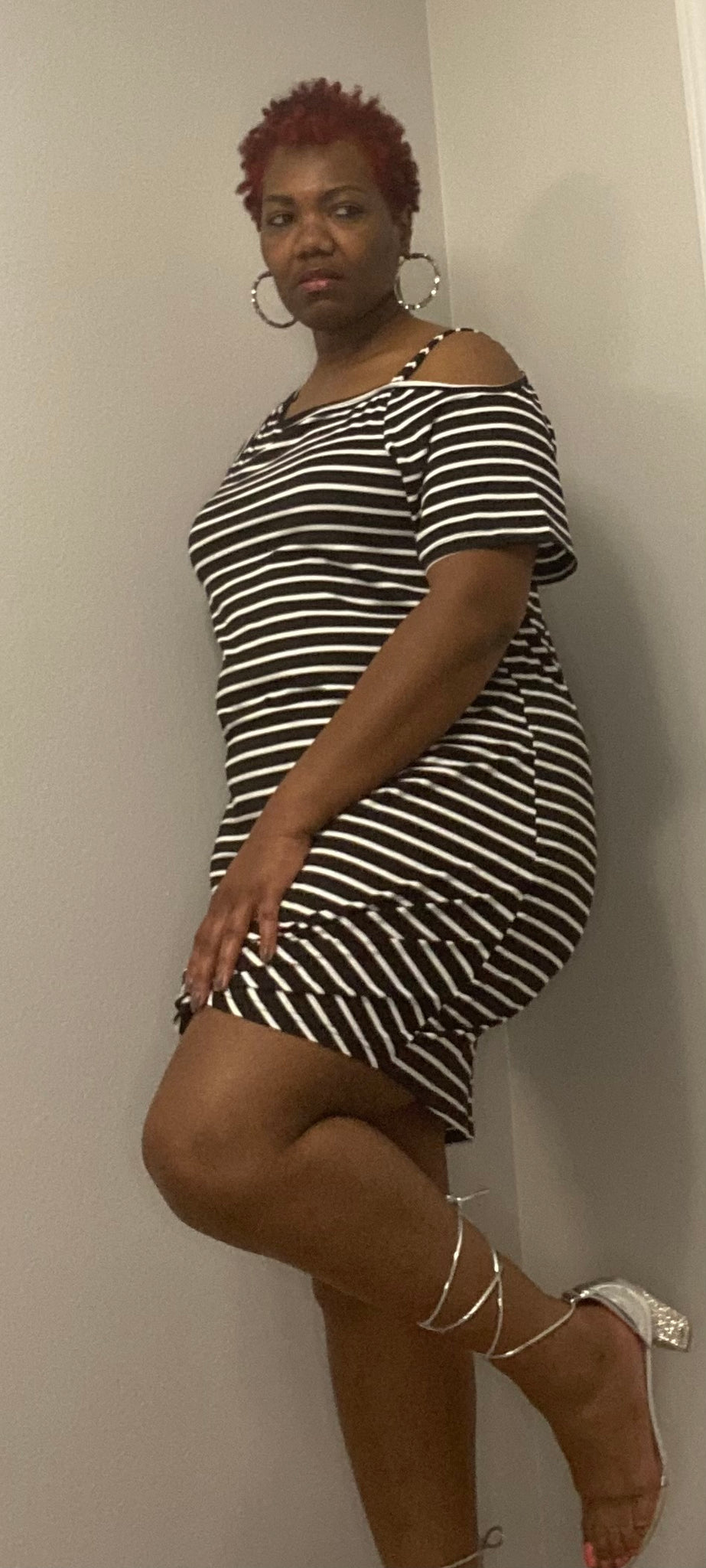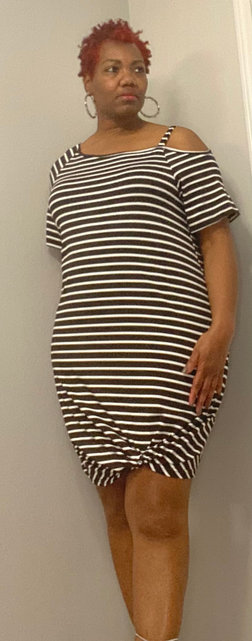 Striped Asymmetrical Neck Twist Tee Dress ( Black & White)